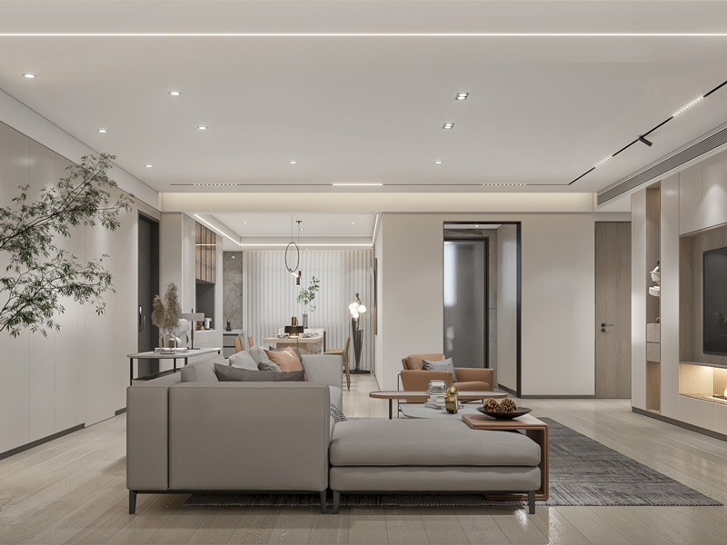 以米白、深灰的低饱和色调定克制基调,浅棕与木饰面注入温暖质感,皮质、石材的点缀强化精致度。冷暖材质碰撞出层次,却无冗余装饰,让空间在简约形制里,既显整洁秩序,又藏生活温度,避免寡淡感。