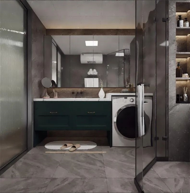 卫生间做了干湿分离设计,白色洗手盆和黑框玻璃淋浴房两者的搭配,让整个空间显得简洁又个性。洗手池做墙排设计,让打扫变得更加方便。