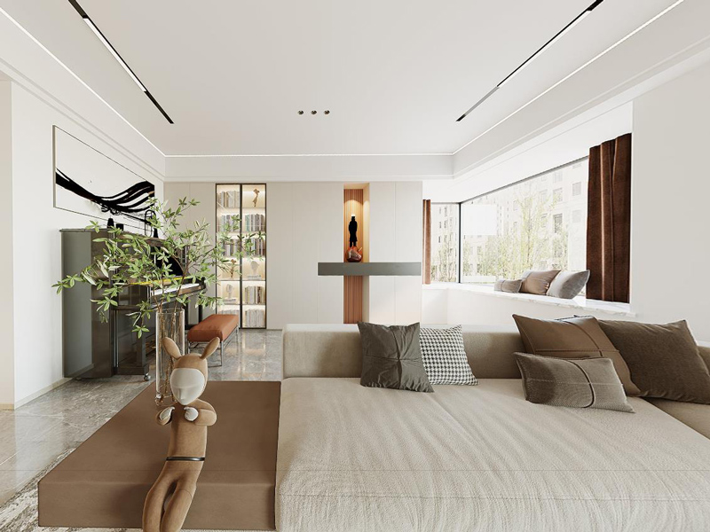 以米白、深灰的低饱和色调定克制基调,浅棕与木饰面注入温暖质感,皮质、石材的点缀强化精致度。冷暖材质碰撞出层次,却无冗余装饰,让空间在简约形制里,既显整洁秩序,又藏生活温度,避免寡淡感。