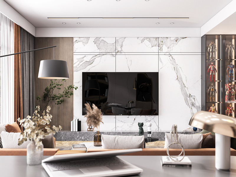 电视背景墙没有采用过多的装饰,以材质的搭配与线条的运用,简雅大方的设计感,用心打造舒适写意家居。