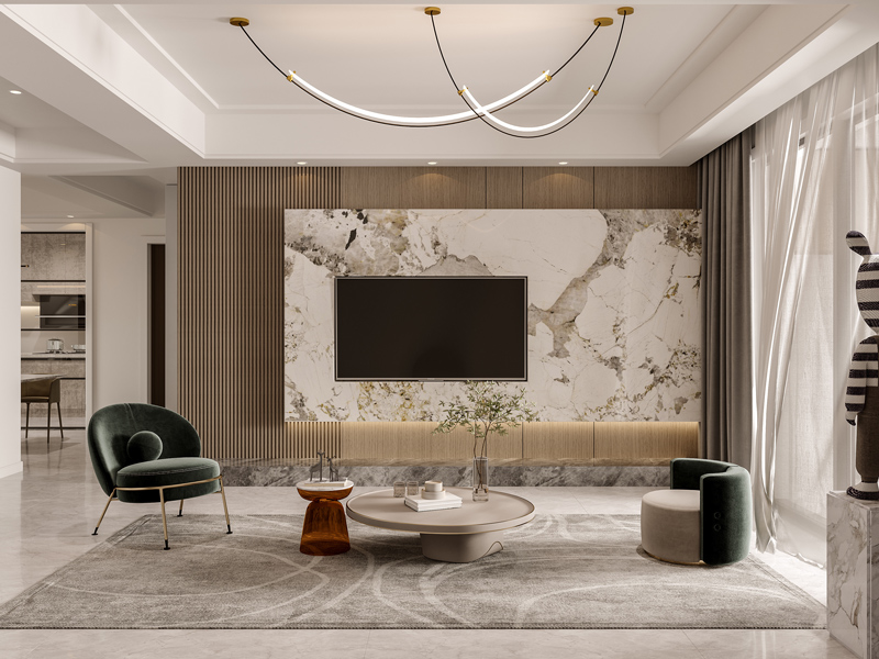 电视背景墙采用大理石与木质拼接的设计,层次丰富,搭配隐藏灯线提升空间氛围感,时尚美观。