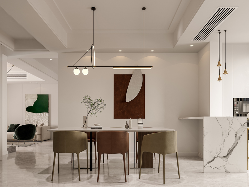 以米白、深灰的低饱和色调定克制基调,浅棕与木饰面注入温暖质感,皮质、石材的点缀强化精致度。冷暖材质碰撞出层次,却无冗余装饰,让空间在简约形制里,既显整洁秩序,又藏生活温度,避免寡淡感。