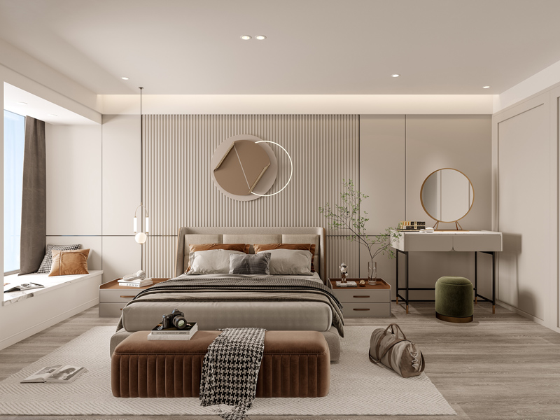 卧室层次感格栅背景墙,提升空间时尚感,整体布局十分饱满,增设飘窗与梳妆台,赋予空间惬意的氛围。