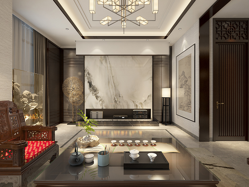 本案定位于新中式风格,从客厅的社交互动、茶室的品茗文化,到卧室的静谧休憩、衣帽间的精致收纳,均在现代材质中融入山水元素、木质肌理等中式细节,诠释传统底蕴与现代生活共生的设计美学。