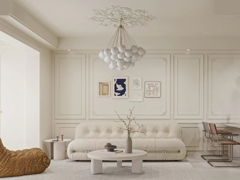 沙发背景墙规则的石膏线设计,搭配挂画设计,时尚清新,让空间视觉上质感更加稳重,柔和自然。