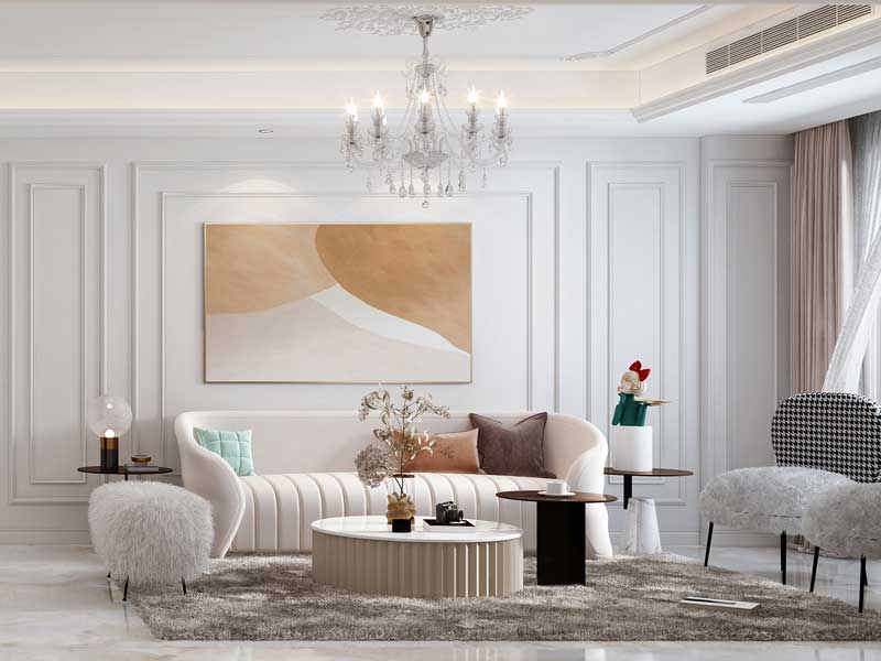 营造温馨舒适的社交与休闲氛围,以白色为主色调,搭配浅棕、淡蓝等柔和色彩抱枕,提亮空间。