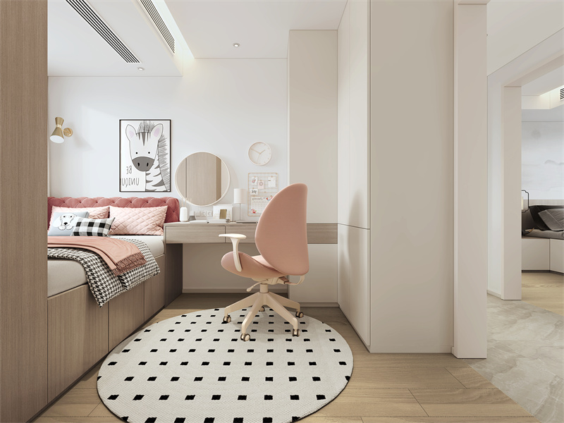 采用粉色与浅木色搭配,打造出充满童趣又温馨的空间。粉色床头与椅子增添活泼感,斑马装饰画、圆形地毯等软装细节丰富了视觉层次。一体化书桌与柜体设计,满足学习与收纳需求,柔和的灯光让房间更显温馨。