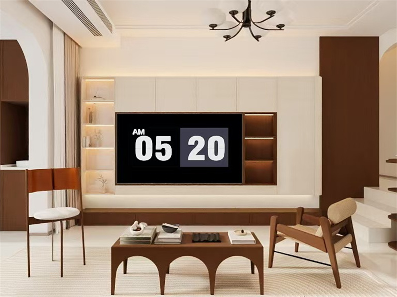 定制的电视背景墙兼具收纳和装饰功能,内嵌的灯带提升了空间的层次感与氛围感。复古造型的吊灯与木质家具相互呼应,散发着复古韵味,让空间既精致又舒适。