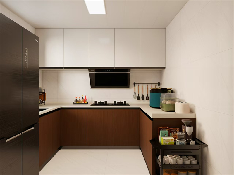 U型的布局更大地利用了空间,方便烹饪操作,上下橱柜提供了充足的收纳空间。黑色的家电与深棕柜体形成色彩对比,让视觉更有层次。