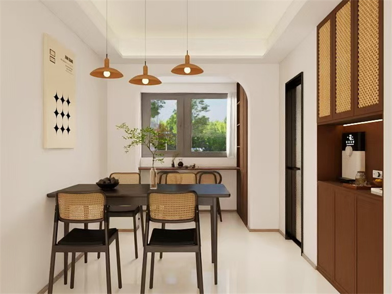 简约与自然风融合,以白棕色调为主,营造出清新自然的用餐氛围。木质餐桌椅搭配藤编元素,传递出自然质朴的感觉。增设餐边柜,整体布局简洁实用。