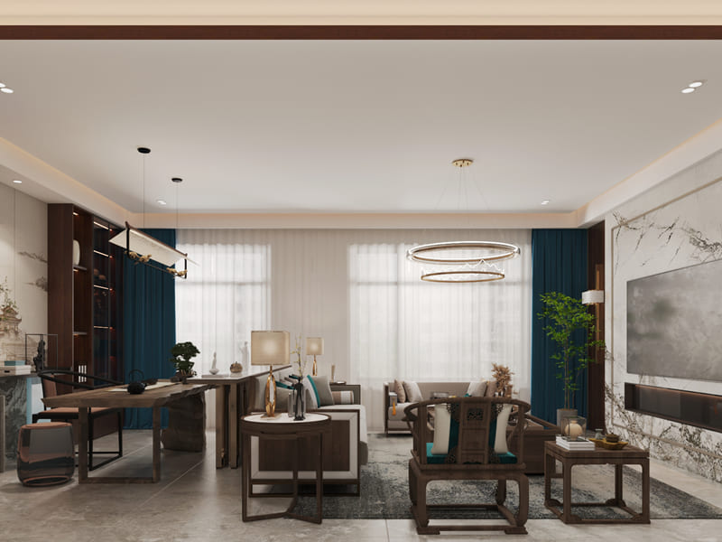 本案定位于新中式风格,从客厅的社交互动、茶室的品茗文化,到卧室的静谧休憩、衣帽间的精致收纳,均在现代材质中融入山水元素、木质肌理等中式细节,诠释传统底蕴与现代生活共生的设计美学。